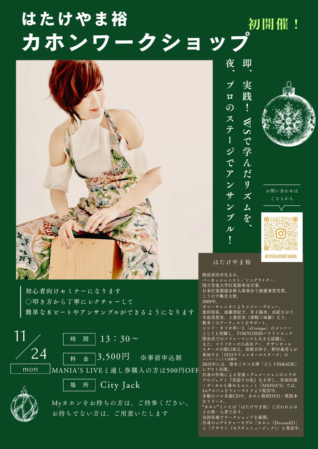 はたけやま裕 カホンワークショップ 初開催! リズムにふれて、音でつながる時間を一緒に✨初心者の方も大歓迎!カホンの叩き方から丁寧にレクチャーして、8ビートや簡単なアンサンブルが楽しめるようになります。 夜にはプロのステージで“学んだリズム”を体感!音楽を“観る”から“奏でる”へ🎶