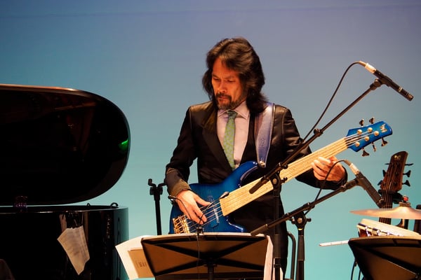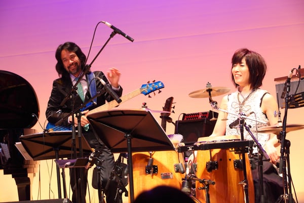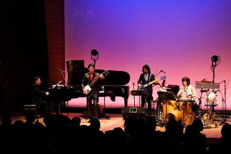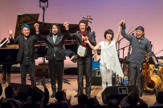 毎年ここでしか聴くことができない、嗜好を凝らしたゲストをお迎えしているヤマハライブですが、第6回目となる今年は、裕さんとは旧知の仲でありこれまでも何度も演奏をしてきている津軽三味線の上妻宏光さんを満を持してお迎えしました。そしてピアノとベースには、第1回のヤマハホールでも共演し、これもまた旧知の伊賀拓郎さんと渡邊裕美さん。そしてもう一人のゲストには、ハナミズキの願いのプロデュースをして頂いて以来、毎年ヤマハライブに出演して頂いている、バイオリニストの古澤巌さん。