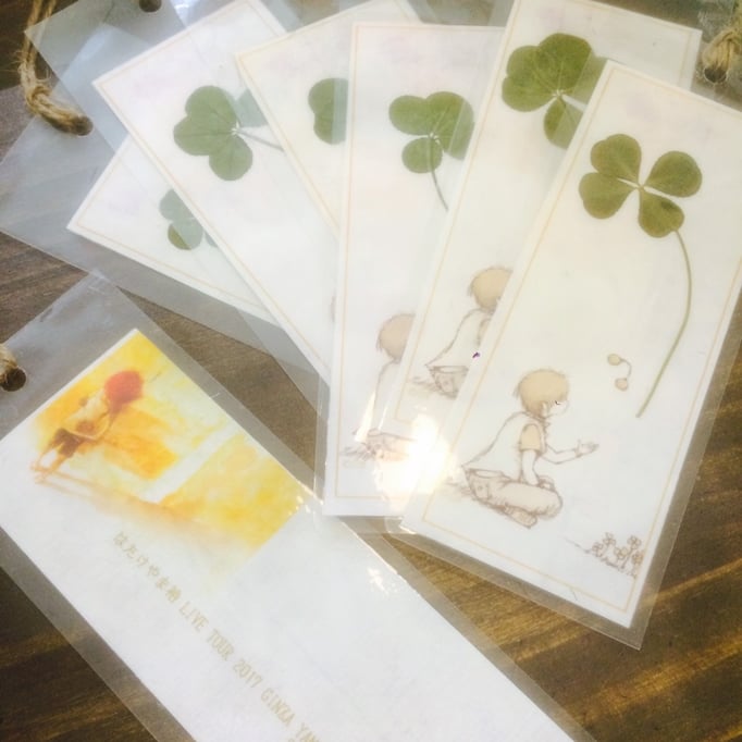 クローバーハンターとしても名高い裕さんが、350枚の四つ葉のクローバーをハントし、一つひとつ押し花にしたものを、カリスマ美容師であり裕さんの専属(?)作詞家でもある森本香さんがデザインして作った、心のこもったしおりです。